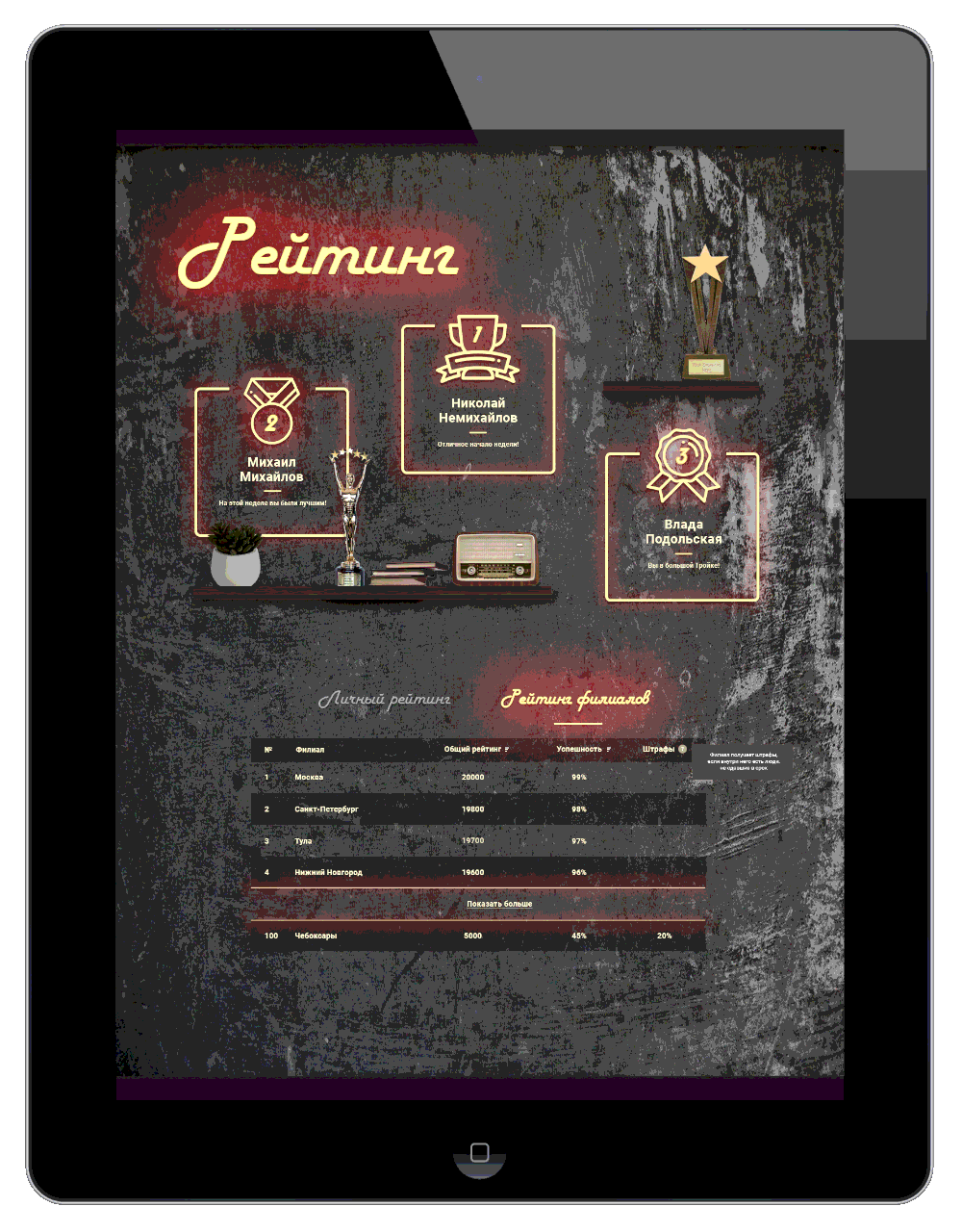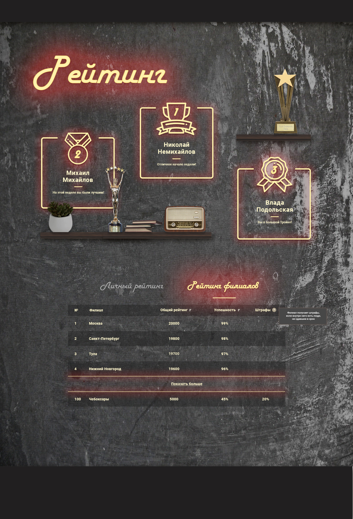 Помимо разработки была задача вовлечь сотрудников в обучение и сделать так, чтобы они сами принимали активное участие в его подготовке, делились идеями. Нужно было сделать командный рейтинг, где каждый филиал действует как команда — чтобы люди помогали и подтягивали отстающих.